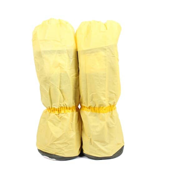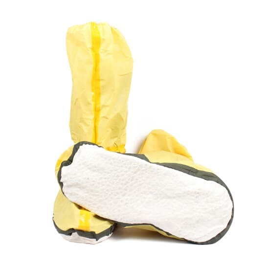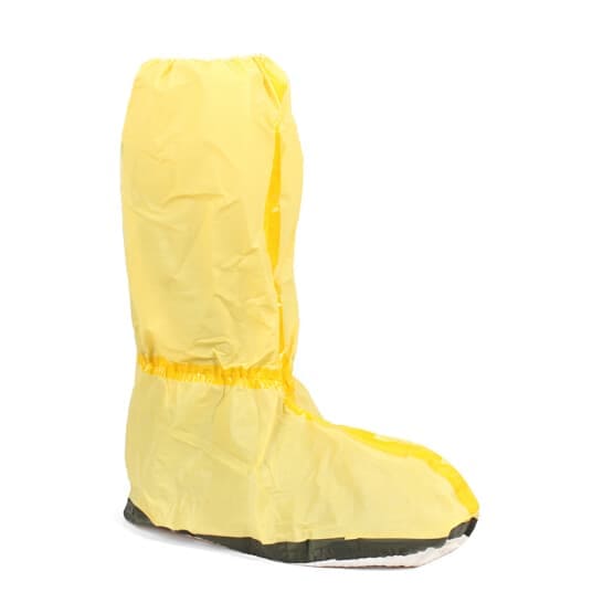 亮黃色高密度聚乙烯膜(HDPE)+紡粘聚丙烯無紡布(紡粘PP)-87克/平米;灰色防滑靴底;熱熔膠帶密封,防滑玉蘭底,熱合膠帶封邊;適用于承壓清洗作業(yè),化學容器清洗作業(yè),農(nóng)業(yè)噴灑作業(yè)及農(nóng)業(yè)處理,有害干燥顆粒處理作業(yè),低毒化學物質(zhì)混合配制,化學品處理,抗血液及病菌的滲透。