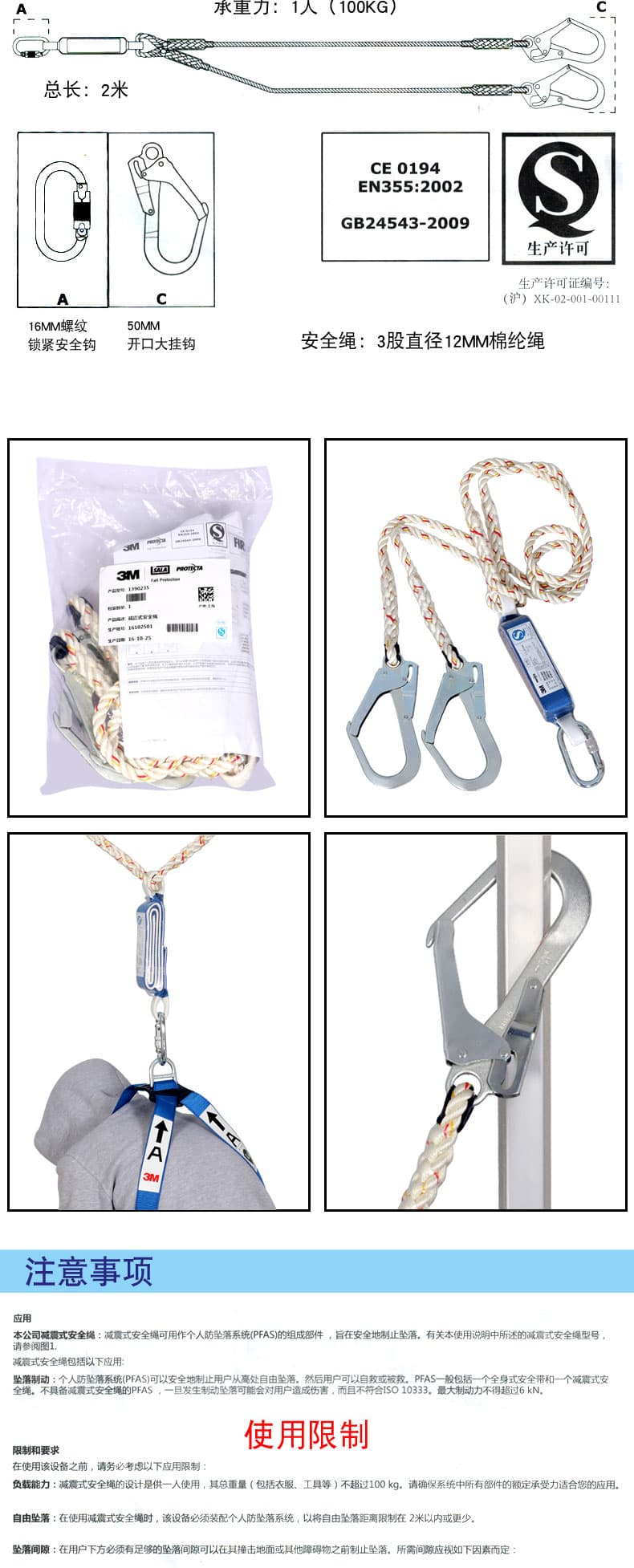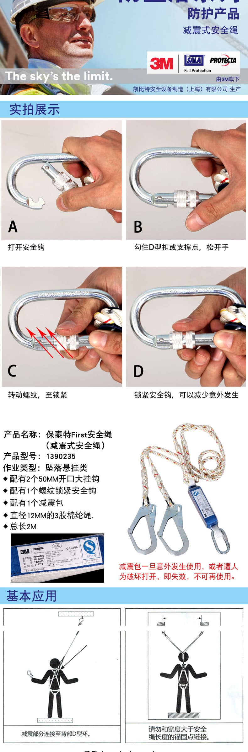 3M 凱比特 1390235保泰特雙鉤連接安全繩除了配有2個50MM開口大掛鉤外,還配有1個螺紋鎖緊安全鉤,以及1個減震包,搭配直徑12MM的3股棉綸繩,總長為2M。